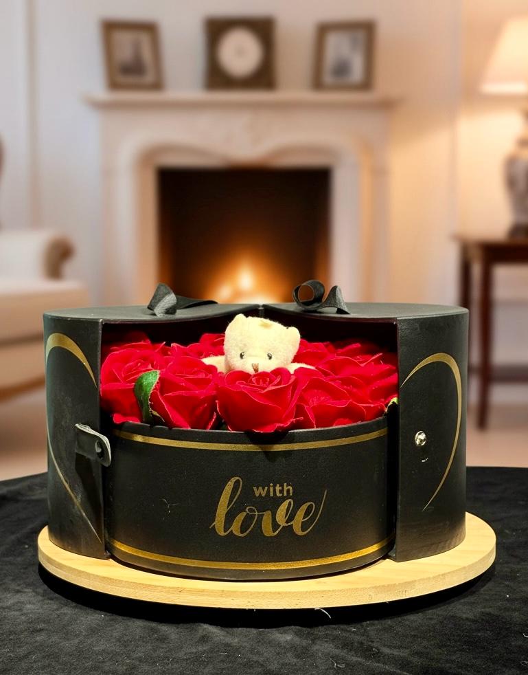 Romantik duyguları zarif bir şekilde yansıtan bu özel tasarım, “With Love” mesaj detayı, sevimli ayıcık figürü ve göz alıcı kırmızı güller ile hazırlanmıştır. Sevginizi anlatmanın şık ve anlamlı bir yolunu sunar.